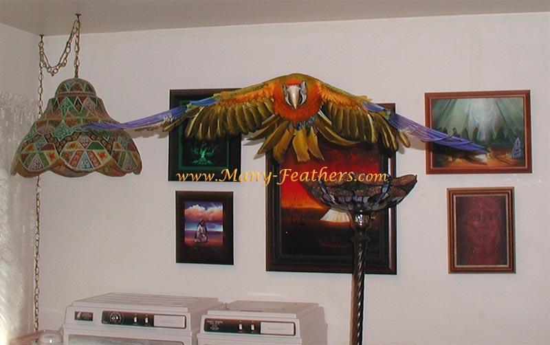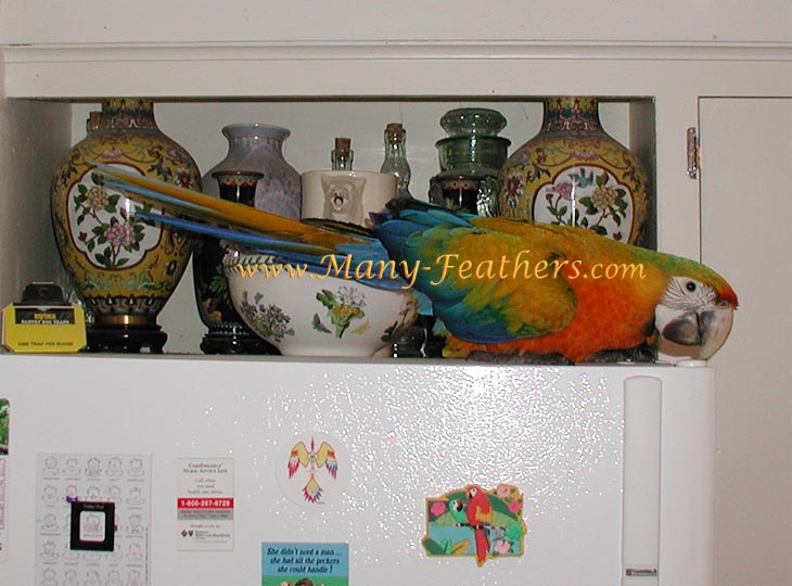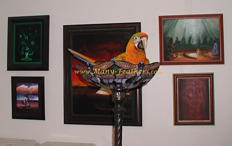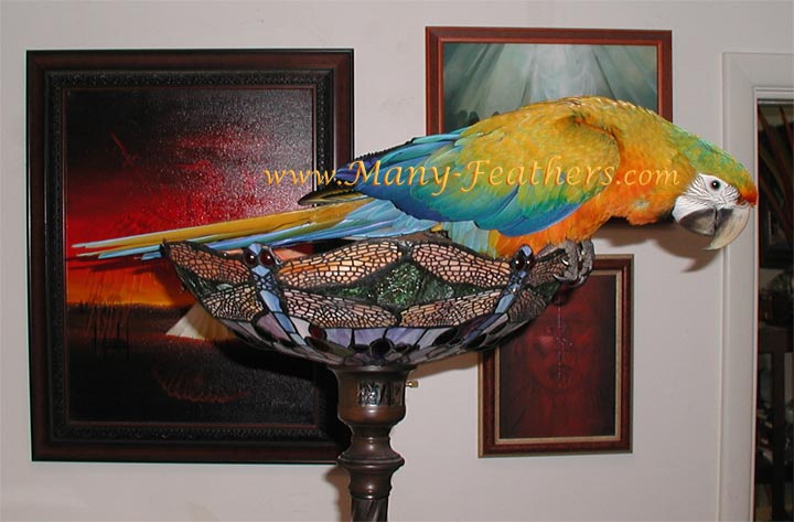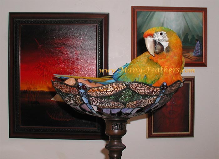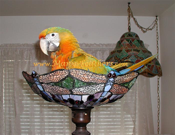 Sundance made a roost in the stainglass lampshade to sit in, so I thought