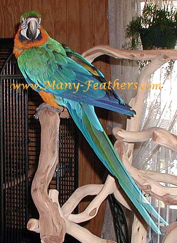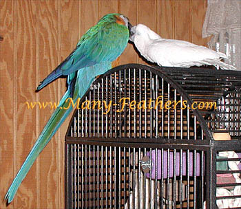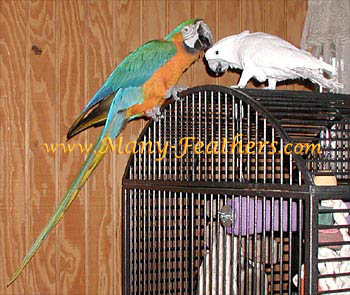 Kachina is my pet Hybrid Catalina Macaw. His Father is a Blue & Gold and his mother is a Scarlet Macaw. I raised Kachina, who is 8 years old, from a baby. He was pulled from the nest when he was 5 days old and handed to me a little while later. Kachina has always had a strong personality, and is friendly, intelligent, and communicative. He can also be destructive. He loves to chew, and anything wood is fair game for his passion. Kachina is very clever and can unlatch & open cage and food dish doors with ease. Kachina's best friend is Pipsqueak, a male Umbrella cockatoo whom he was raised with. Kachina, who has an enormous vocabulary, knows several of the birds names. Pipsqueak is special to him and he will call him, "C'mere Pippy. Pippy, c'mere!" when he wants to play. When Kachina is with Pipsqueak you can not get near him. He is very possessive and protective of his Umbrella Cockatoo! Catalina Macaw, Kachina has a large & comprehensible vocabulary with the phenomenal knack of interjecting appropriate words & phrases for the person, feeling or event. One evening I went into the macaw room to get Pippy to put him to bed. Kachina who puts himself to bed in his own cage as soon as its dark, was already inside. I went to lock Kachina's cage door and didn't realize he had come to the front and I was beginning to close it on his toes, until Kachina yelled out, "Oh, GOD!" Then he apologetically announced , "I'm sorry," and then looked up at me and sincerely asked, Are you OK?" I am always astounded by the accuracy of his communications. |