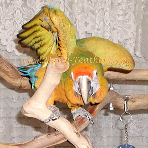the 2 Capri Macaws above are very brilliant because of the striking contrast of their colors. Not every Capri or Camelot Macaw pair produces the same color youngsters. All are different. The genetics of the parents determines the markings of the offspring. The Scarlet macaw father of the siblings above has an extraordinarily wide band of yellow on his wings, & the yellow dominant Camelot Macaw mother hearkens from a parental lineage that produced exceptionally beautiful Camelot Macaw offspring during their breeding years.