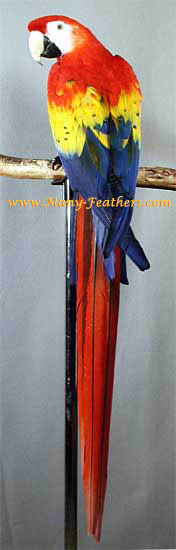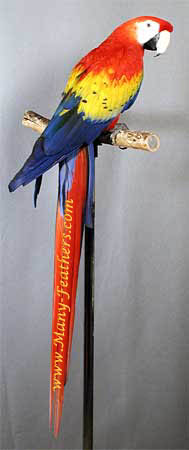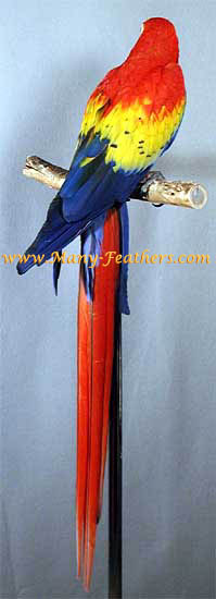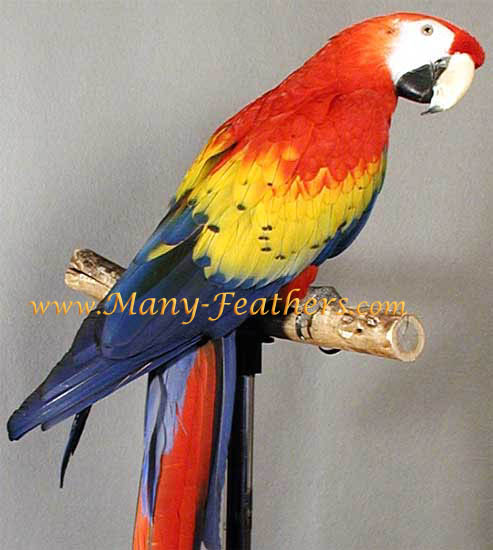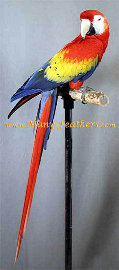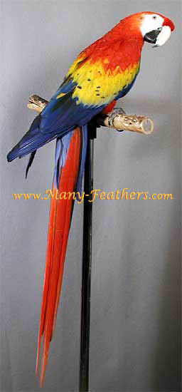 While never once losing composure, Hobbs permitted me to turn the perch around to photograph without changing her position, other than occasionally turning her head. Hobbs is a fairly large Central American Scarlet Macaw, with a lot of yellow and barely even a hint of green anywhere in her markings. She weighs around 1250 grams and has a 27-1/2" long tail. |